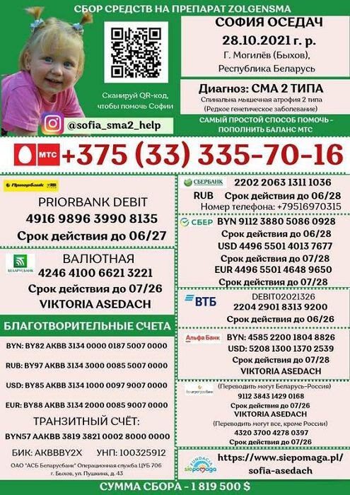 София Оседач, 28.10.2021 года рождения, из города Быхова нуждается в дорогостоящем лечении. У девочки диагностировано редкое генетическое заболевание – спинальная мышечная атрофия 2 типа. Остановить прогресирование болезни может только один из самых дорогостоящих препаратов в мире Zolgensma.