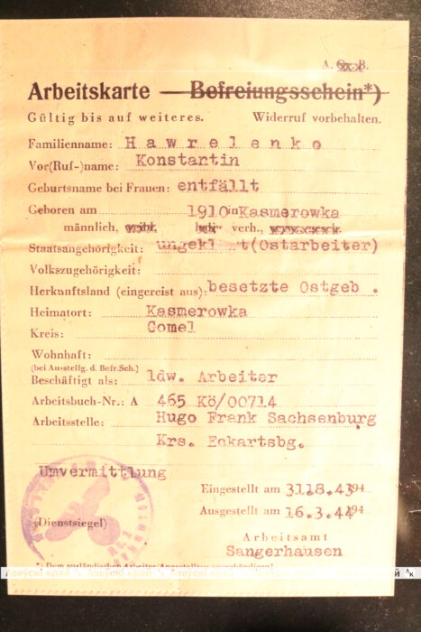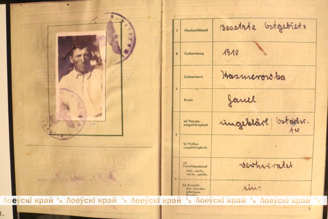 В Государственном архиве Гомельской области в фонде № 3100 хранится более 30 тыс. личных дел на граждан Гомельской и Полесской областей, которые возвратились из «немецкой каторги». Одно из них рассказывает о нашем земляке из д. Казимировка Константине Лукиче Гавриленко. Войну он встретил тружеником в колхозе «Красный партизан». На фронт его так и не мобилизовали. До середины мая 1942 года он продолжал работать в местном хозяйстве, пока вместе с односельчанами не был мобилизован оккупантами. В Германии уроженца Лоевщины отправили на сельскохозяйственные работы. Сначала белорус был у одного хозяина, а с июля 1942 года его перевели на ферму Хуго Франка, которая находилась в деревне Заксенбург округа Эккартсберга. Здесь Константин жил в лагере для остарбайтеров. Так продолжалось до победного мая 1945-го, пока немецких рабов не освободили американцы и не передали Красной армии. В 1946 году через польскую границу К. Гавриленко вернулся домой. Как он позже вспоминал жизнь в немецком рабстве была похожа на ад: нечеловеческие условия, постоянный голод и работа до изнеможения. Арийцы считали славян людьми второго сорта, не имеющими прав на нормальную жизнь.
