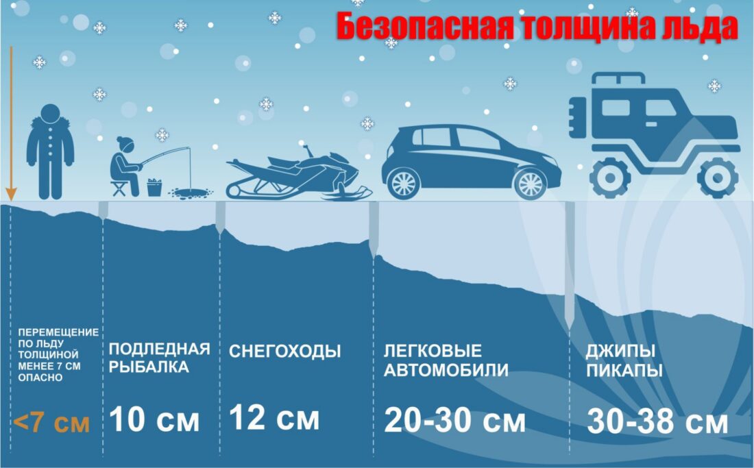 Лед толщиной не менее 10 см в пресной воде и 15 см — в соленой считается безопасным для человека.