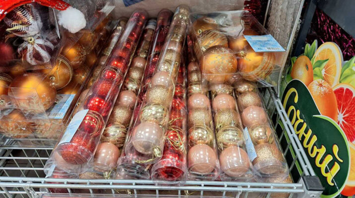 В магазинах райцентра можно отыскать оригинальные игрушки и украшения: милые снеговики, красочная мишура, рождественские венки, носки и новогодние колпаки. Продаются как одиночные экземпляры, так
