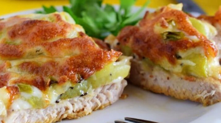 Вариант классического мяса с фруктами под сыром. Для приготовления понадобиться: 500 гр мякоти свинины, 2 киви, 150 гр твердого сыра, 100гр майонеза, 1 луковица,