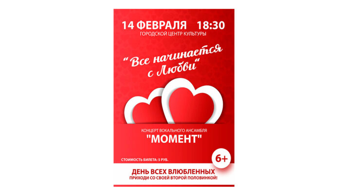 КОНЦЕРТ «ВСЁ НАЧИНАЕТСЯ С ЛЮБВИ» ВОКАЛЬНОГО АНСАМБЛЯ «МОМЕНТ» ПРОЙДЕТ 14 ФЕВРАЛЯ В ГЦК Г.П. ЛОЕВ