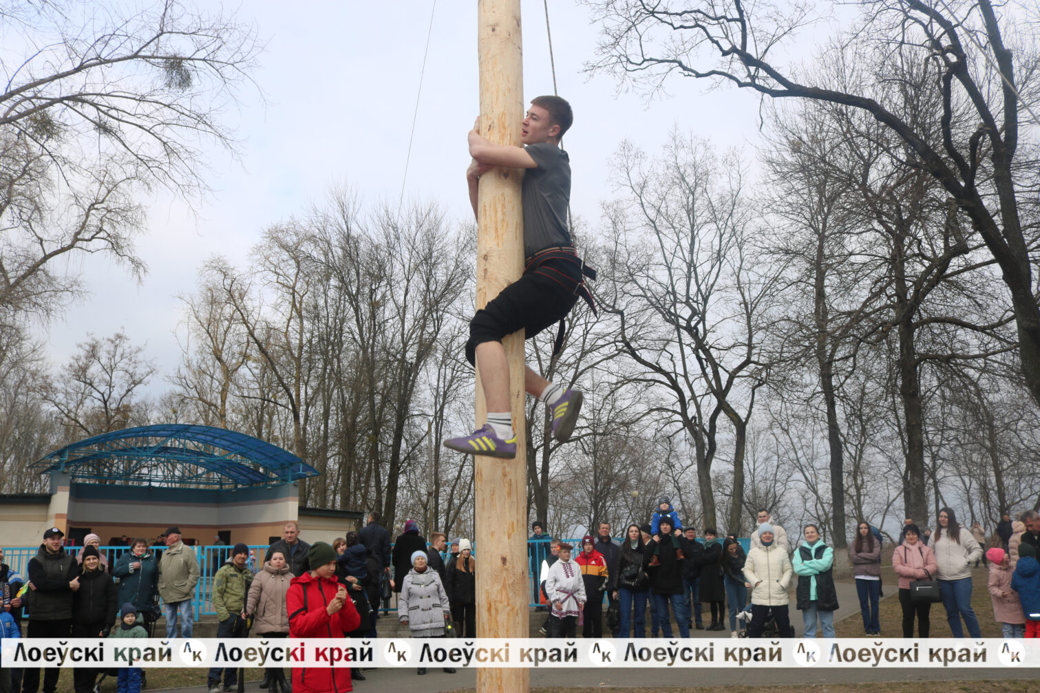 Представители сильной половины Лоевщины спешили продемонстрировать свою удаль в аттракционе «Масленичный столб». Больше десятка смелых парней попытали счастья в покорении деревянного олимпа. В этом нелегком состязании пробовали себя даже девушки. Те, кому хватило сил добраться до верхушки, получили заслуженные призы.