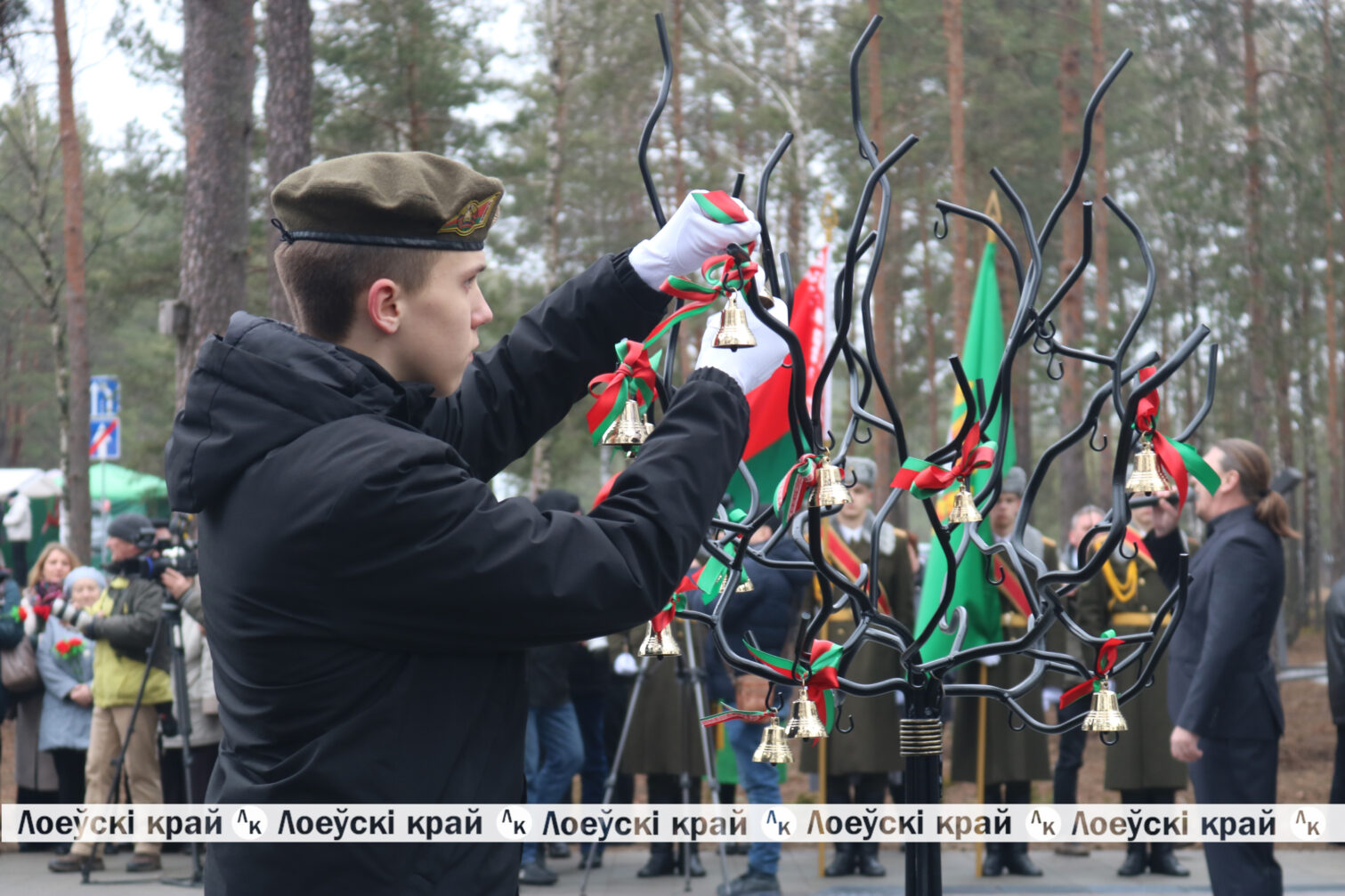 Под пронзительные слова композиции «Колокола» дети, молодежь, взрослые на символичном древе памяти оставили колокольчики, символ того, что печальный перезвон колоколов памяти не стихает, а все так же с болью откликается в сердцах людей.