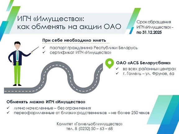 Ознакомиться с перечнем обществ, акции которых предлагаются к обмену на ИПЧ «Имущество», можно на сайте Комитета государственного имущества Гомельского облисполкома (https://gomeloblim.gov.by) в разделе «Деятельность» — «Обмен акций на ИПЧ «Имущество».