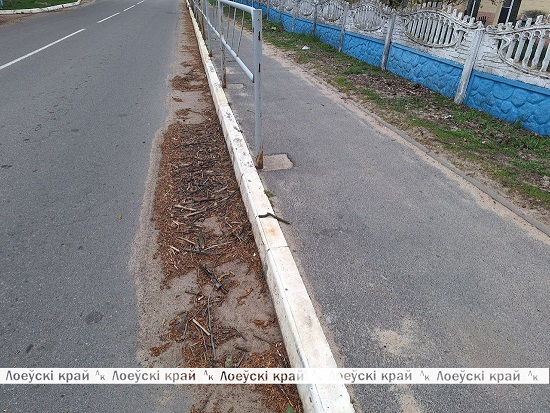 Неприглядная картина ожидает прохожих на улице Синякова. Несмотря на то, что каждую неделю в районе проходят санитарные дни по наведению порядка неподалёку от административного здания КМУП «Лоевское ПМС» на проезжей части вдоль бордюрного камня наблюдается беспорядок, Ветви деревьев и песок на дороге, кучи прошлогодней пожухлой листвы под заборами вдоль тротуара создают неухоженный вид и словно намекают на бесхозяйственность. Надеемся, что после нашей публикации ответственная служба или закреплённое предприятие потрудиться здесь на славу!
