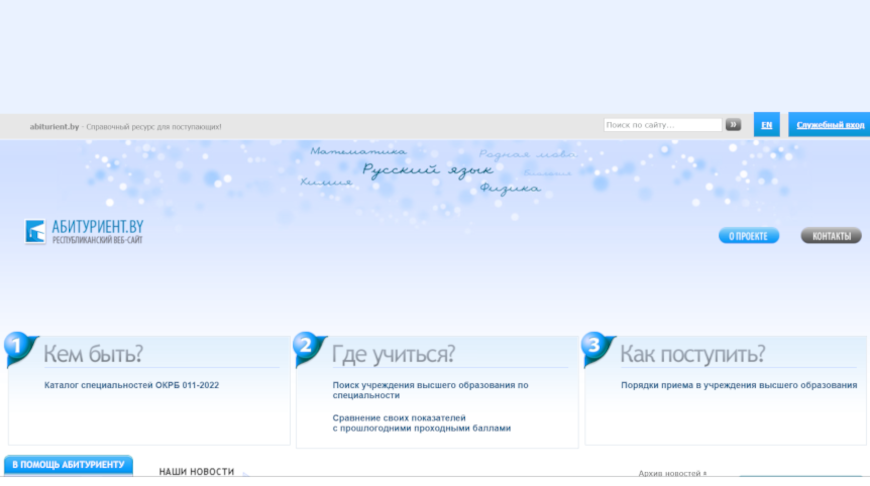 С помощью средств сайта можно получить информацию, в каких учреждениях образования Беларуси ведется подготовка по выбранным специальностям, а также сравнить свои показатели при поступлении в текущем году с проходными баллами прошлых лет.