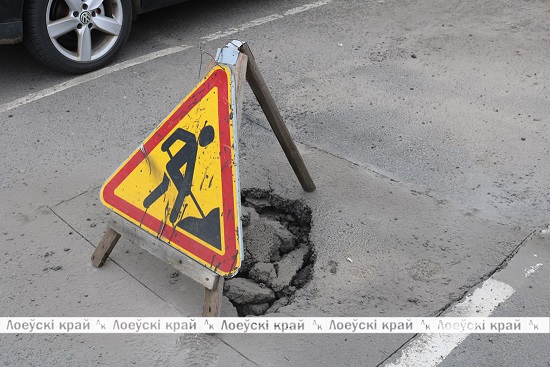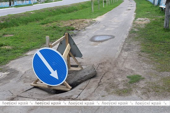 Возле поликлиники Лоевской ЦРБ в объектив корреспондентов попала уже знакомая картинка — провал в дорожном полотне на автомобильной стоянке. Об опасной ситуации водителей предупреждает