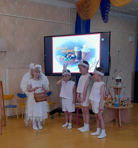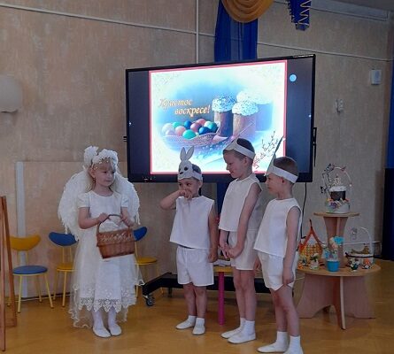 Затем настоятель храма иерей Димитрий Чварков стал гостем праздничного мероприятия «Светлая Пасха», подготовленного воспитателем учреждения Еленой Хмель, где дошколята рассказывали стихи, танцевали и играли в интерактивные игры, помогающие узнать детям и взрослым о событиях Пасхальных дней.
