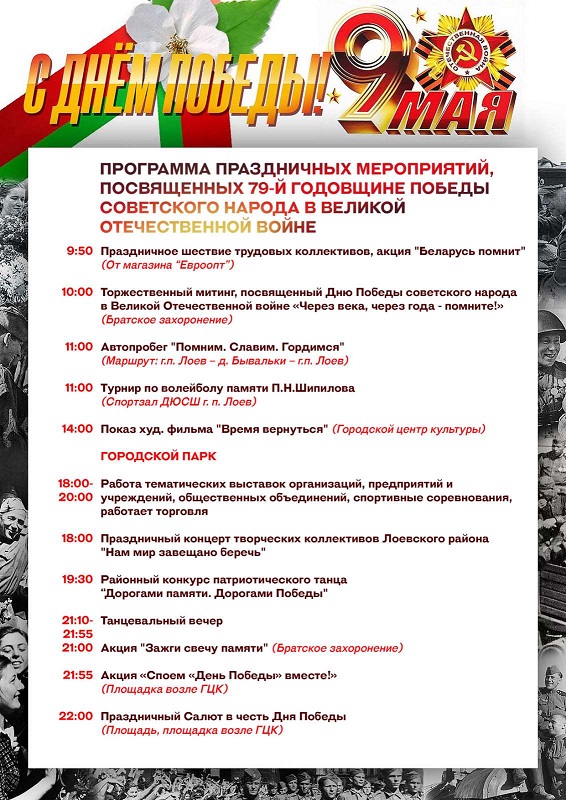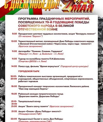 Инфографика 07.05.202407.05.2024 ПРОГРАММА ПРАЗДНИЧНЫХ МЕРОПРИЯТИЙ, ПОСВЯЩЕННЫХ 79-Й ГОДОВЩИНЕ ПОБЕДЫ СОВЕТСКОГО НАРОДА В ВЕЛИКОЙ ОТЕЧЕСТВЕННОЙ ВОЙНЕ Опубликовал: Лоевский край
