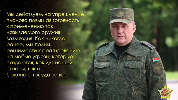 «И наше участие во втором этапе учения Вооруженных Сил Российской Федерации по применению нестратегического ядерного оружия — тому подтверждение. Сегодня мы действуем на упреждение, планово повышая готовность к применению так называемого оружия возмездия. Как никогда ранее, мы полны решимости к реагированию на любые угрозы, которые создаются как для нашей страны, так и Союзного государства», — сказал Виктор Хренин.