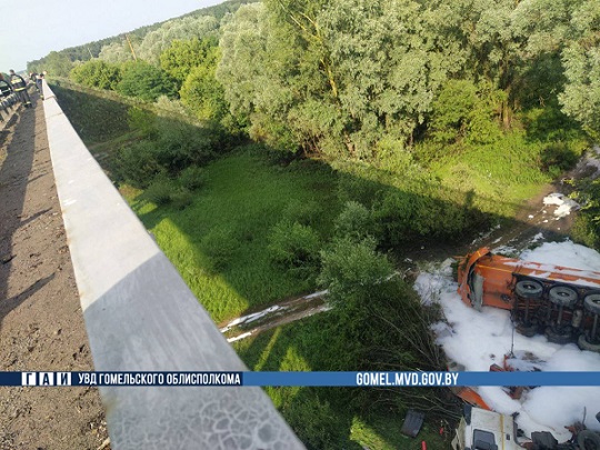 По информации УВД Гомельского облисполкома, 6 июня примерно в 17.00 36-летний водитель «Вольво» с полуприцепом-цистерной объемом почти 25 тонн двигался со стороны Калинковичей в направлении Гомеля. При проезде моста через реку Днепр съехал за пределы проезжей части, пробил ограждение и опрокинулся с моста.