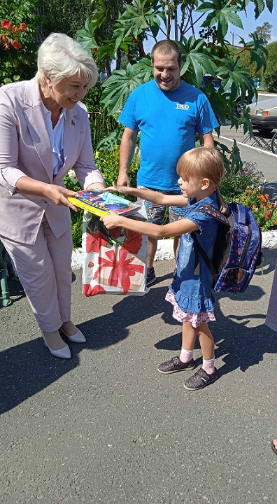 А ещё в этот день Тамара Петровна приняла участие в акции «Собери портфель первокласснику» и вручила рюкзак с необходимыми принадлежностями Лидии Сницар из многодетной семьи. Родители будущей ученицы поблагодарили её за помощь, отметив, что это хорошее подспорье к сборам в школу, ведь в семье воспитываются пятеро детей.