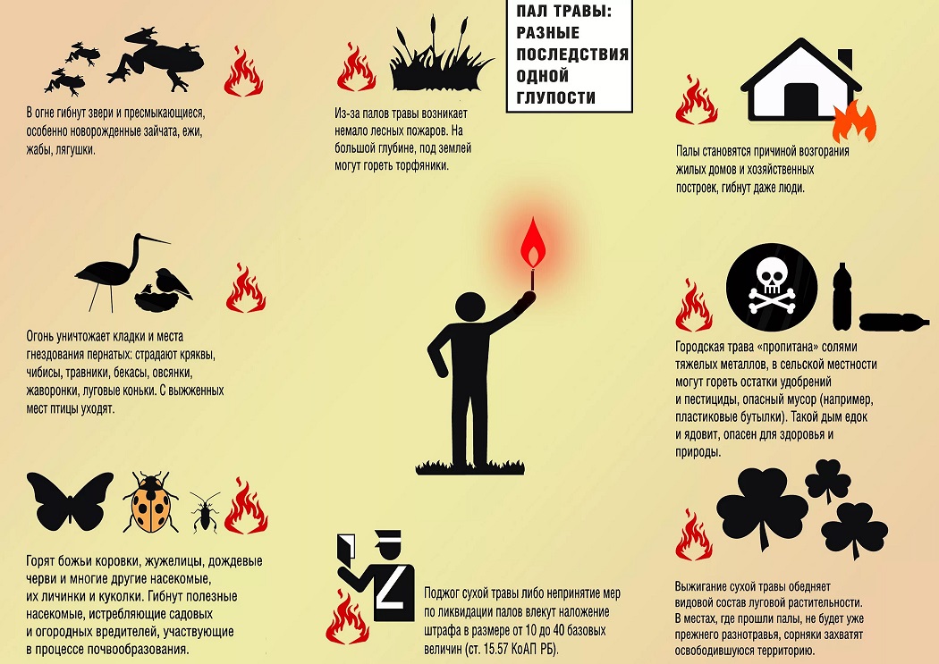 МЧС напоминает: за выжигание сухой растительности, трав на корню, стерни и пожнивных остатков на полях, либо непринятия мер по ликвидации палов на земельных участках, а также разжигание костров в запрещенных местах – предусмотрена административная ответственность в виде штрафа.
