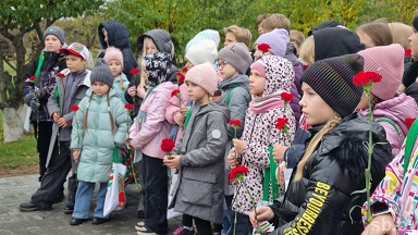 Участники «Марафона единства», который сегодня, 25 октября, стартовал в Жлобине, посетили мемориальный комплекс «Памятник детям — жертвам Великой Отечественной войны» в агрогородке Красный Берег.