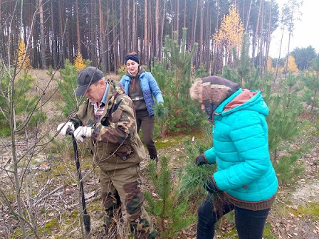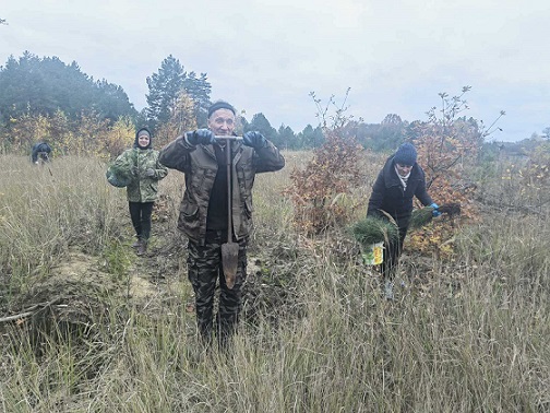 Вооружившись посадочным материалом и разделившись на пары и команды, все активно приступили к работе, наполнив окрестности осеннего леса смехом и хорошим настроением. Пусть новые деревья растут, крепнут и хорошеют!