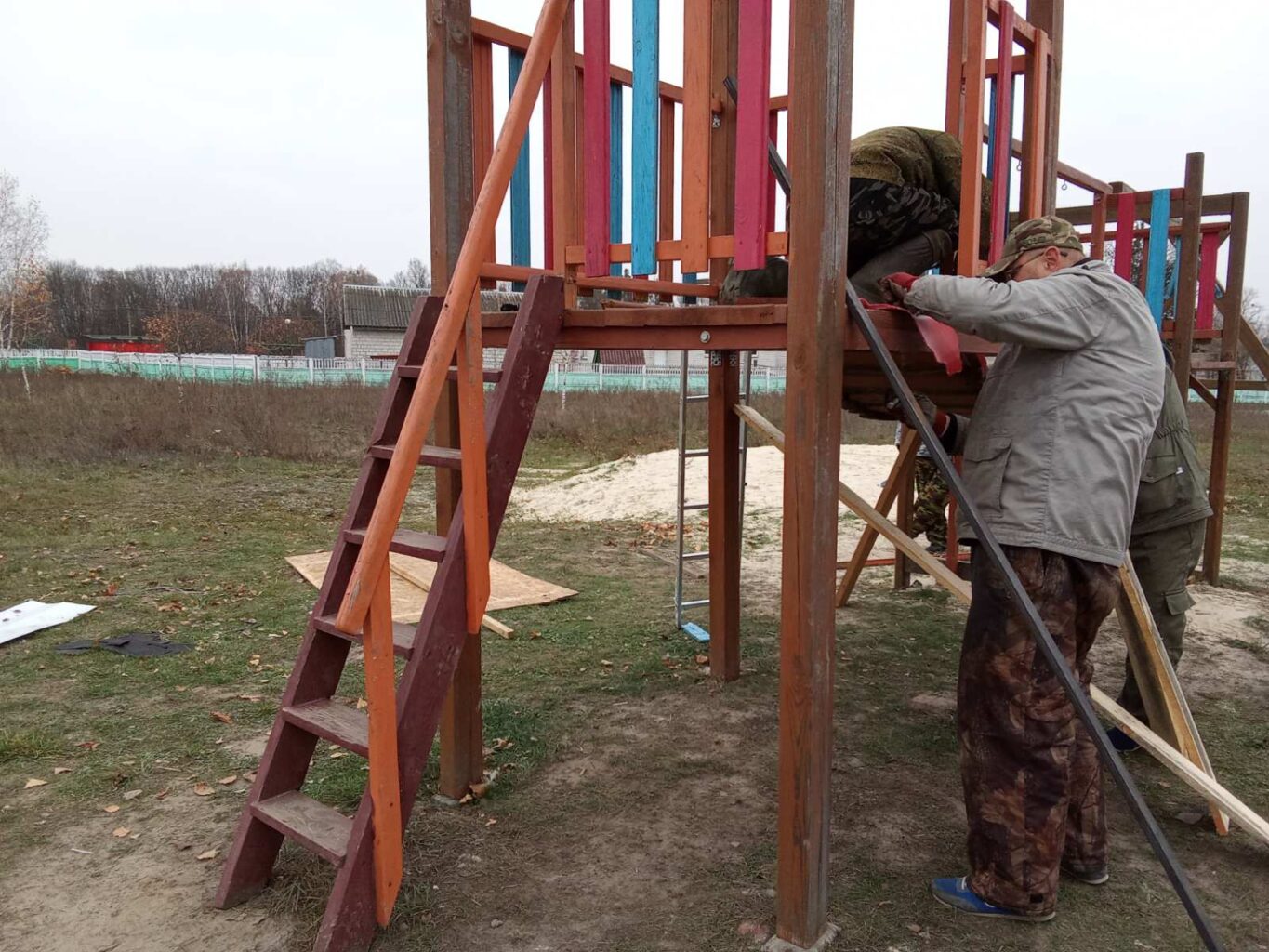 На просьбу откликнулось 10 мужчин, двое из которых работники Лоевской ЦРБ. Все добровольцы пришли с инструментами и желанием помочь. Каждый вносил свой вклад: кто-то занимался ремонтом горок, а кто-то восстанавливал крышу.