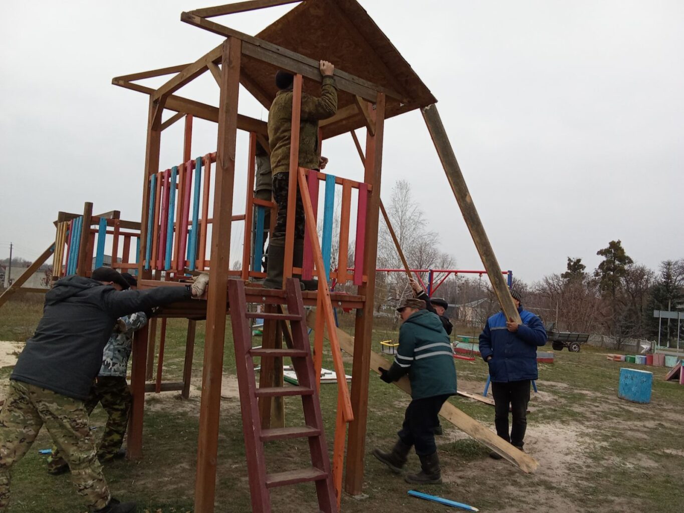 В аг. Переделка Страдубского сельсовета от недавнего ураганного ветра пострадал детский городок. Но его быстро своими умелыми руками восстановили местные жители.