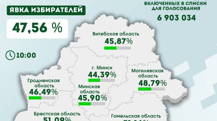 На 10.00 явка избирателей составила 47,56 %. В Гомельской области процент составляет 51,16%.