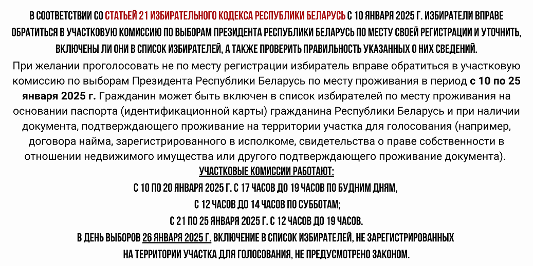 ВЫБОРЫ — 2025 10.01.202510.01.2025 С 10 января 2025 г. избиратели вправе обратиться в участковую комиссию по выборам Президента Республики Беларусь по месту своей регистрации и уточнить, включены ли они в список избирателей. Опубликовал: Лоевский край