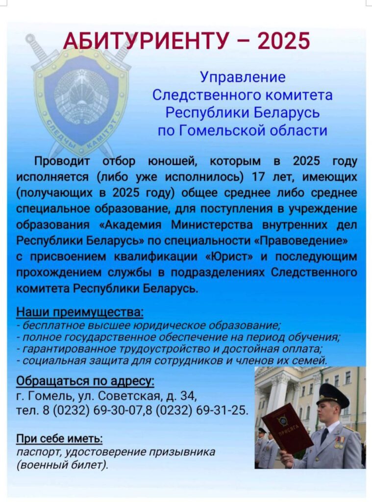 Если у Вас есть намерение связать свой профессиональный выбор с правоохранительной сферой и Вы рассматриваете для себя возможность стать курсантом следственно-экспертного факультета Академии МВД, чтобы в последующем проходить службу в Следственном комитете Республики Беларусь, приглашаем Вас до 1 апреля 2025 года (а лучше – в ближайшее время) обратиться в Лоевский районный отдел Следственного комитета Республики Беларусь для прохождения собеседования и получения подробных разъяснений о порядке дальнейших действий.
