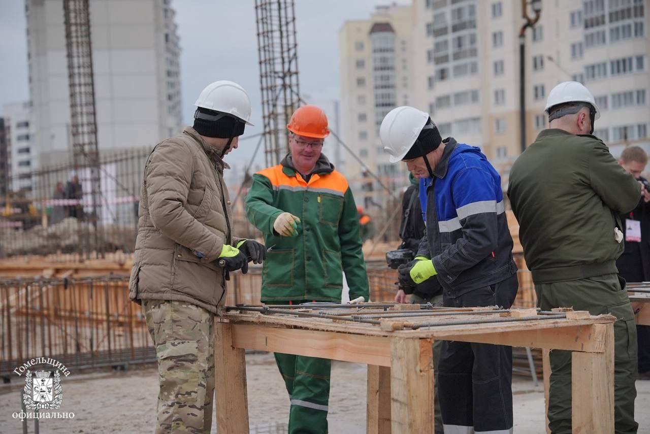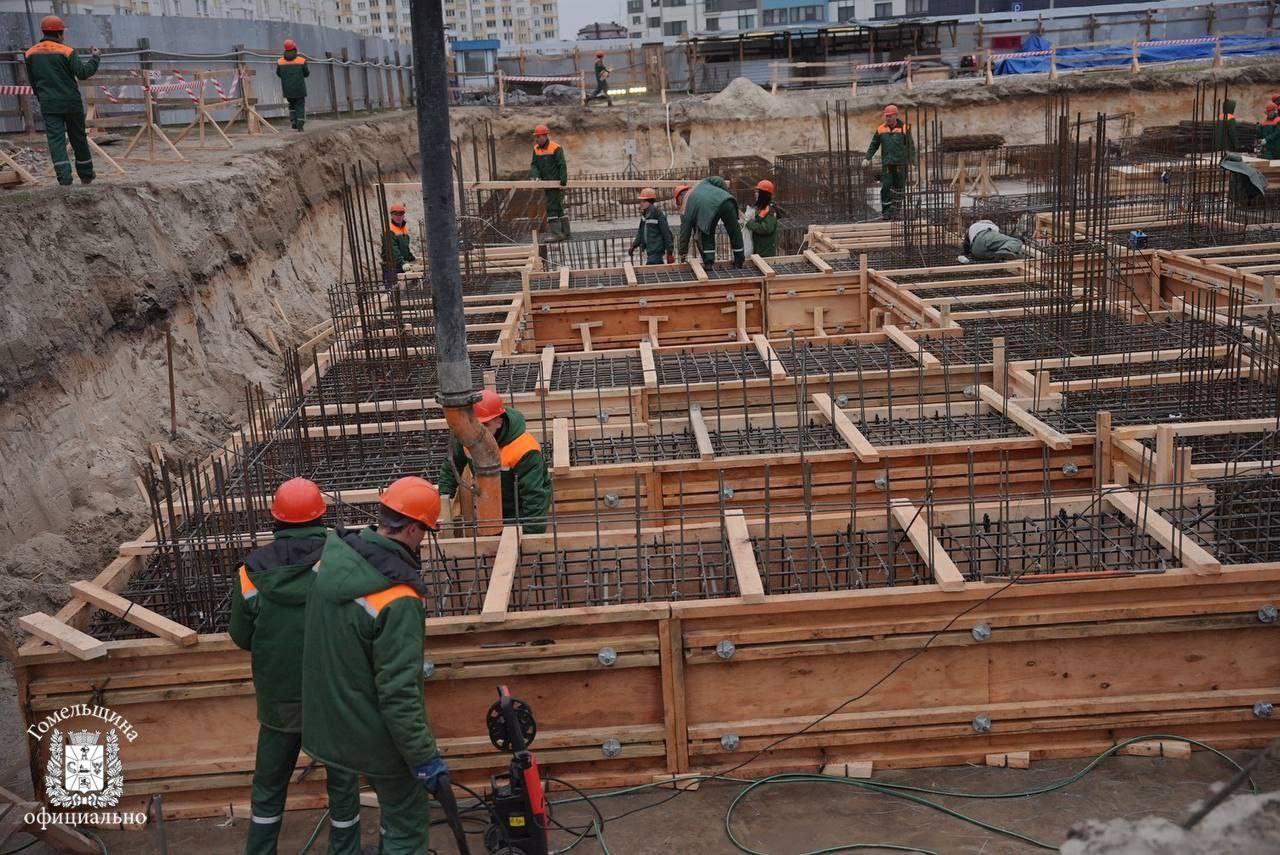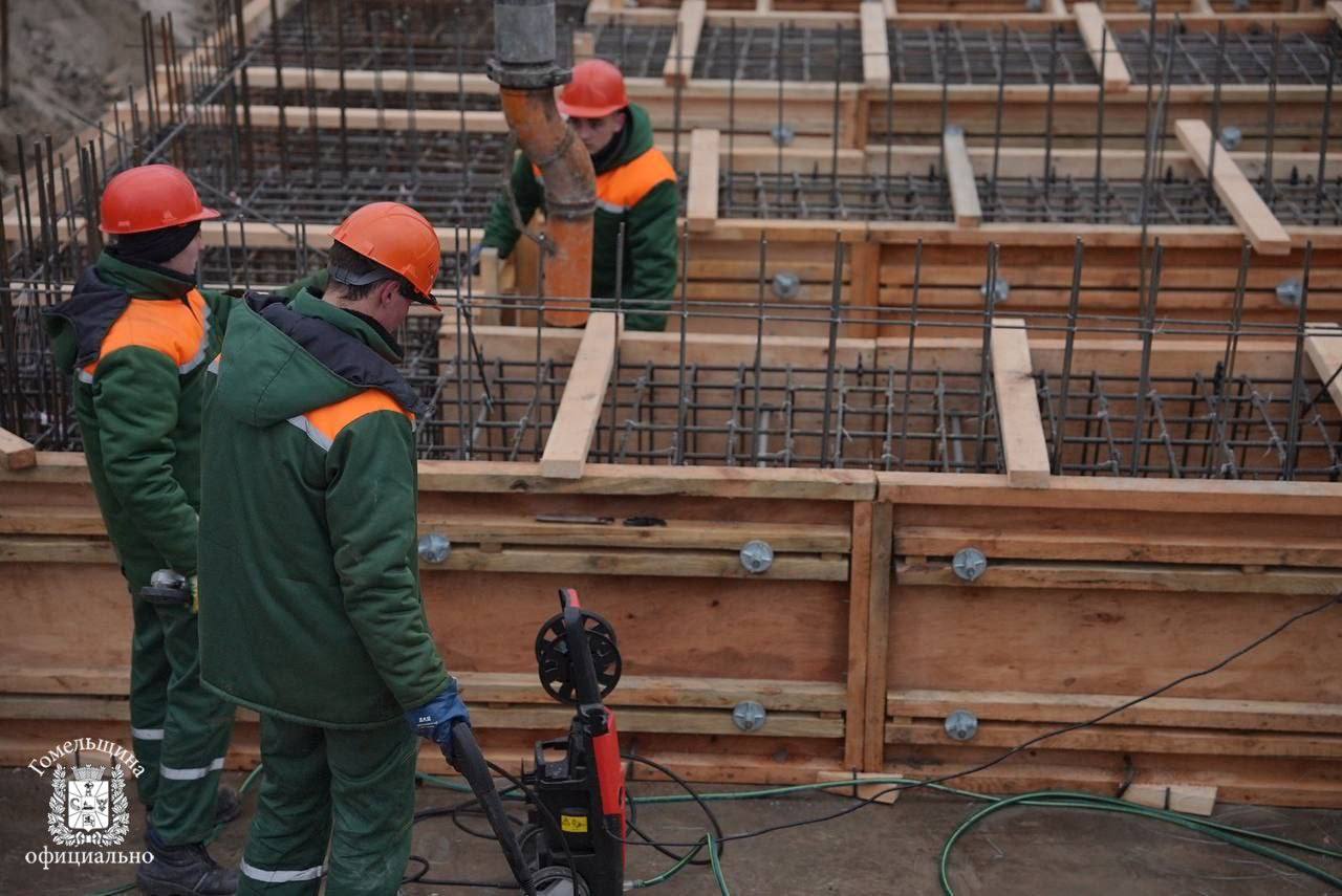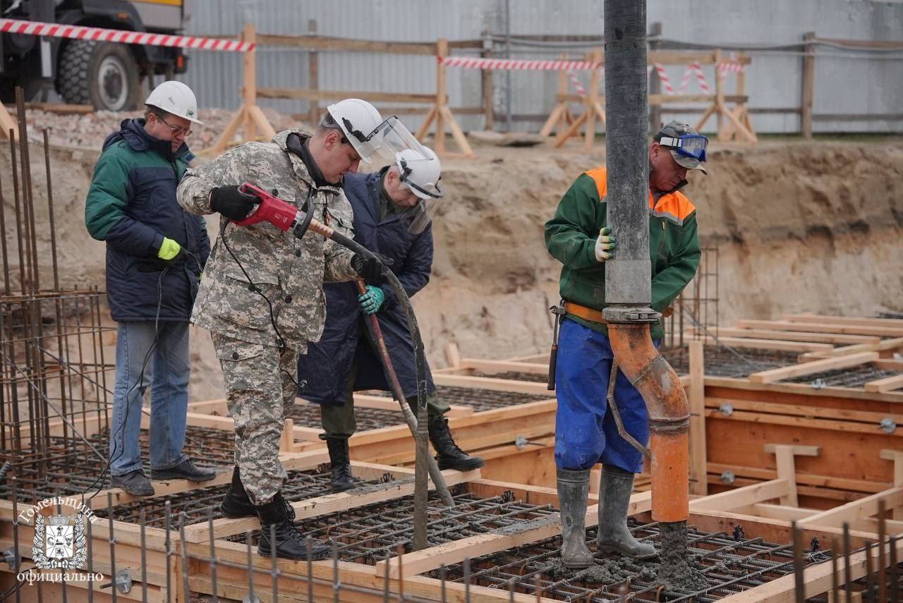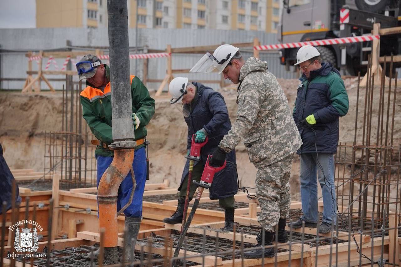 Председатель облисполкома Иван Крупко, его заместители, помощник Президента – инспектор по Гомельской области Руслан Пархамович, член Совета Республики, председатель областного Совета депутатов Екатерина Зенкевич трудятся на стройке детской поликлиники в Новобелицком районе Гомеля. Руководители закладывают фундамент будущего объекта здравоохранения.