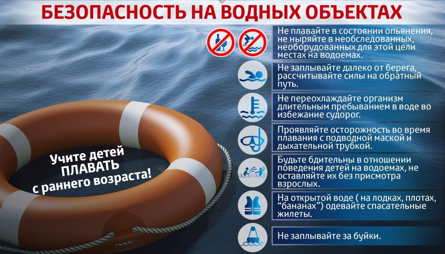В летние жаркие дни вода притягивает как магнит как детей, так и взрослых, каждый хочет искупаться в прохладной воде, понежиться под лучами солнца, прогуляться по берегу реки или озера. Во время отдыха у водоемов всегда нужно помнить – вода таит в себе опасность! Чтобы Ваш отдых был удачным, следует не забывать правила безопасного поведения у воды.