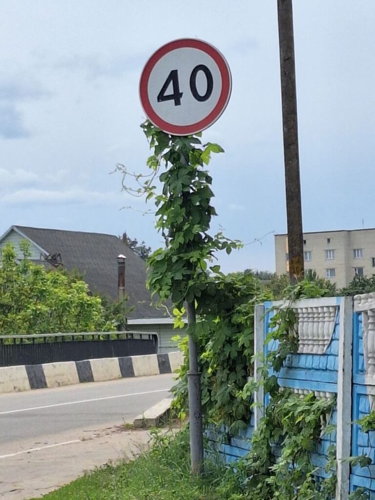Необычный арт-объект обнаружили зорким оком журналисты на улице Ленина в горпосёлке неподалёку от автостанции. Запрещающий знак, ограничивающий скорость автомобилистов до 40 км/ч, оказался в плену дикорастущей лианы, называемой в простонародье «дикий» огурец. Самое интересное, что мимо него проезжают многие службы, в том числе и дорожные, но освободить из природных оков — не кому. Надеемся, что дорожники приведут данный объект инфраструктуры горпосёлка в надлежащее состояние