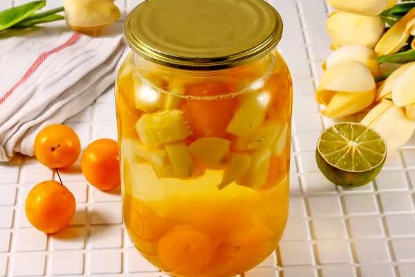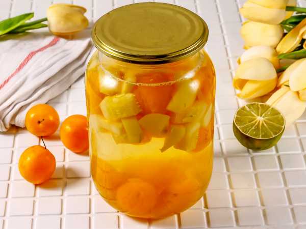 Ингредиенты: 300 г желтой алычи, 5 кабачков, 300 г сахара, 2 л воды, лимонная кислота.