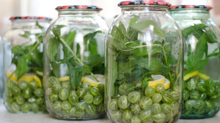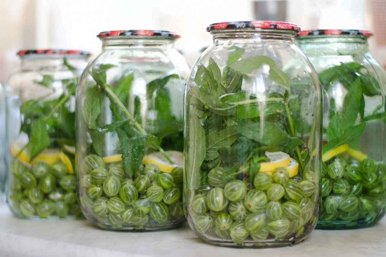 ИНГРЕДИЕНТЫ: (на 1 трехлитровую банку): крыжовник — 500 г, сахар — 250 г, лимон — 2 дольки, мята — 1 веточка среднего размера.