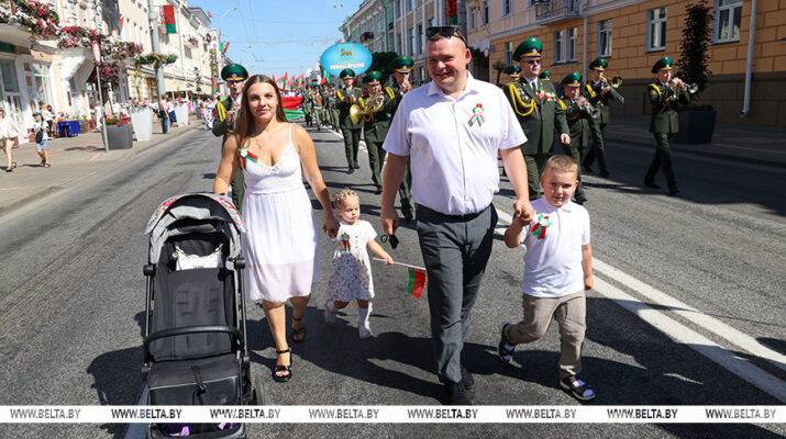 «Сегодняшний праздник — это и 81-я годовщина освобождения Беларуси от немецко-фашистских захватчиков. Мой прадедушка воевал, был радистом. У него есть награды. Благодаря поисковому сайту мы узнали его боевой путь, потому что сам он у нас был очень стеснительный, мало рассказывал о тех страшных временах», — поделилась участница шествия.«И этот праздник еще про то, что сегодняшнеепоколение готово трудиться, приумножать богатства нашей страны», — добавила горожанка.