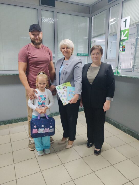Сегодня маленькая Кира из горпосёлка получила свой первый портфель с набором школьных принадлежностей. Главный атрибут первоклассника ей вручили от трудового коллектива ЦБУ 316 АСБ «Беларусбанк» директор Тамара Демиденко и председатель первичной профсоюзной организации Елена Плющай. Мама девочки, Марина Болошенко, является специалистом по оказанию розничных банковских услуг и сейчас находится в декретном отпуске. Приятным дополнением к подарку стало обучающее пособие по финансовой грамотности для школьников и стилизованные наклейки.