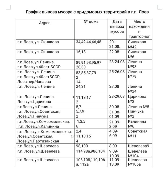 В период времени с 20 августа 2025 г. по 20 сентября 2025 г. на территории Лоевского района проводится республиканская акция «Чистый двор — комфортная жизнь». В рамках данной акции жителям многоквартирных жилых домов и частной застройки предлагается провести мероприятия по благоустройству своих придомовых территорий. Для погрузки собранных отходов будут установлены тракторные прицепы согласно графику (прилагается).