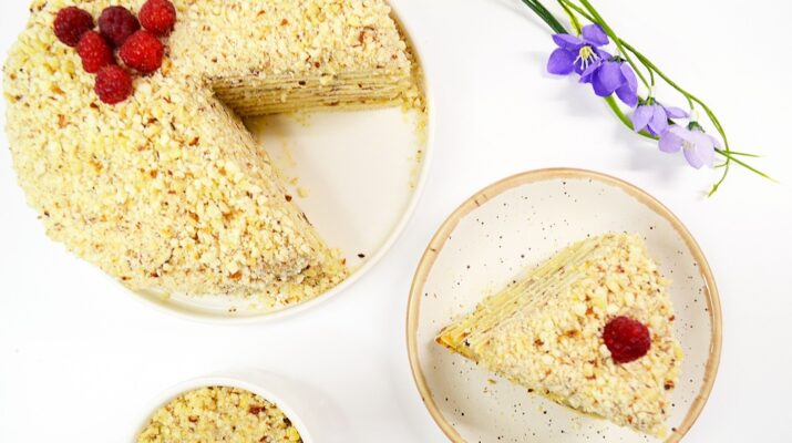 Из указанного количества ингредиентов получается небольшой торт диаметром 16-18 см и высотой в 8 тонких коржей. Он немного плотнее бисквитной выпечки, но при этом сохраняет интересную многослойную текстуру. В коржах слегка ощущается освежающая кислинка творога, а крем делает его отдаленно похожим на классический «Наполеон».
