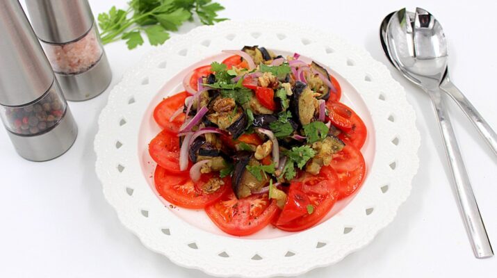 Простой и сезонный грузинский салат с баклажанами и орехами можно подать по-разному, делая его вид чуть более праздничным. Хотя почему сезонный? Сейчас любые овощи можно найти на полках магазина круглогодично. Лёгкий хруст орехов, сытный баклажан дополненный свежим, сочным помидором, этот грузинский салат не оставляет за собой равнодушных.
