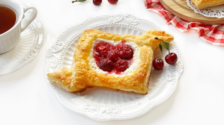 Такую выпечку часто готовили в детстве — брали домашний творог, ягоды из компота и готовое слоёное тесто. Сейчас можно немного поэкспериментировать: добавить немного апельсиновой цедры, сливочного сыра или заменить вишню на другие ягоды — черешню, сливу или смородину.
