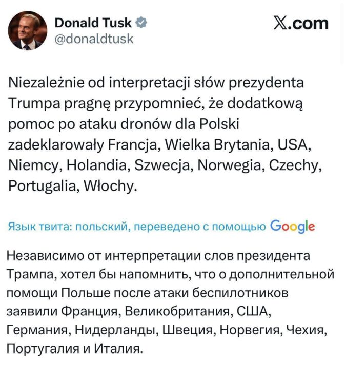 Франция, Великобритания, США, Германия, Нидерланды, Швеция, Норвегия, Чехия, Португалия и Италия пообещали оказать дополнительную помощь Польше, — написал Туск