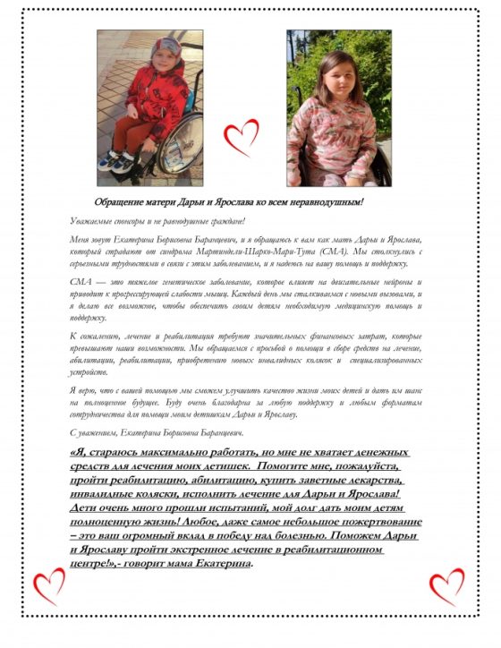 Обследование Дарьи и Ярослава проводились в Республиканском научно-практическом центре «Мать и дитя». У Дарьи и Ярослава симптомы проявились после 18 месяцев. Дети с СМА 3 группы ходили в раннем возрасте, но позже развилась прогрессирующая слабость мышц ног и рук. Казалось бы, предостаточно бед для детей. Но прогрессирующая мышечная слабость в ногах и руках, отсутствие ходьбы, ухудшает здоровье детей. Мама обратилась к врачам – и было обнаружено резкое ухудшение здоровья. Спинальная амиатрофия 3 типа с вялым умеренно выраженным тетрапарезом, больше выраженным в нижних конечностях — это жизненно опасное состояние, возникшее в случае детей. К постоянным занятиям с психологом, психиатром, массажистом, логопедом, прибавились проблемы так же с физическим здоровьем, а именно проблема с подвывихами тазобедренного слева, остаточное ацетавулярная диплазия. На лечение уходят тысячи бел., рублей, и вот сейчас мама перешла грань, когда остается только надеяться на помощь социально ориентированных спонсоров. Многие организации не остаются равнодушны к нашим подопечным. Мы очень уважительно относимся к нашим спонсорам, и вновь обращаемся к вам для оказании помощи Дарьи и Ярославу!