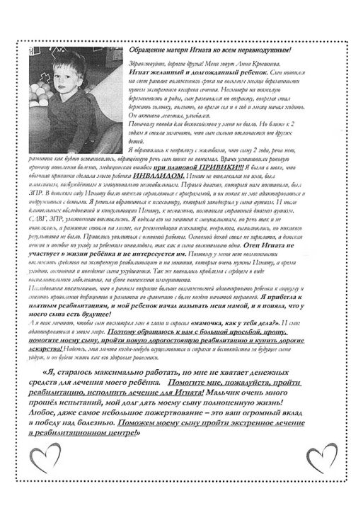 «Я, стараюсь максимально работать, но мне не хватает денежных средств для лечения моего ребёнка. Помогите мне, пожалуйста, пройти реабилитацию, исполнить лечение для Игната! Мальчик прошел очень много испытаний, мой долг дать моему сыну полноценную жизнь! Любое даже самое небольшое пожертвование — это ваш огромный вклад в победу над болезнью. Поможем моему сыну пройти экстренное лечение в реабилитационном центре!», — говорит мама Анна.