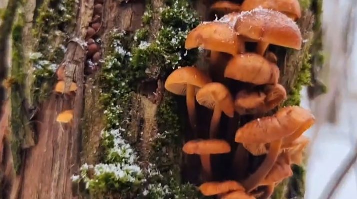 В пятиминутном видео мужчина шаг за шагом идёт по лесу по колено в снегу, осторожно обходя снежные сугробы и ветки. И вот чудо: даже среди зимнего пейзажа на деревьях и валежнике начинают пробиваться грибы.