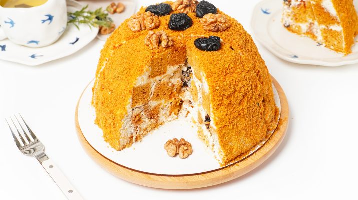 Торт получается очень нежным, воздушным, чернослив и грецкие орехи безупречно сочетаются с легкими медовыми нотками. Но стоит учитывать, что на финальный вкус сильно влияет тип выбранного меда. Разумеется, синтетический дешевый мед не идет ни в какое сравнение с натуральным.