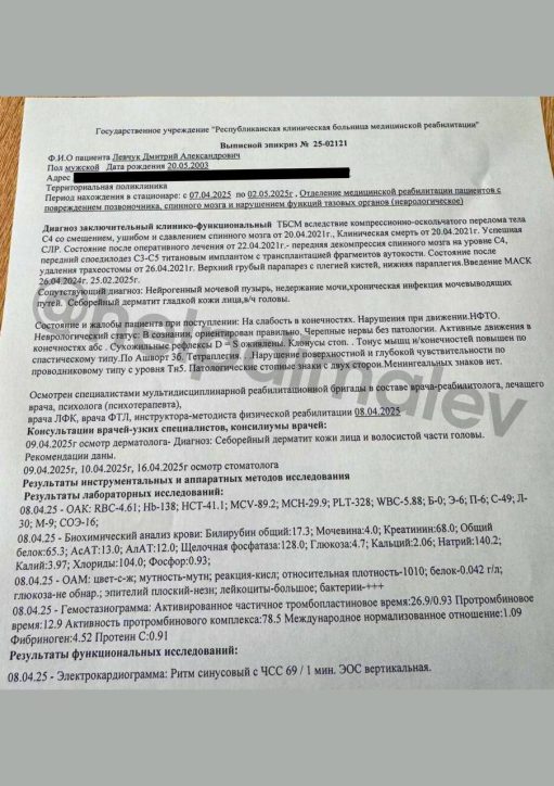В результате травмы 20.04.2021г. у Дмитрия диагностировали – травматическую болезнь спинного мозга вследствие компрессионно-оскольчатого перелома тела С4 со смещением, ушибом и сдавливанием спинного мозга от 20.04.20021г., клиническая смерть 20 минут от 20.04.2021г. У Димы полный паралич конечностей.