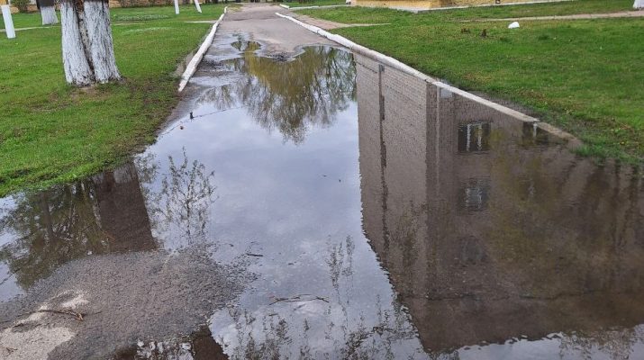 Очередным порывом встречает прохожих улица Шевелёва. На участке дороги между зданием педколледжа и общежитием уже образовалось небольшое озерцо. Искусственный водоем появился в результате водопроводной