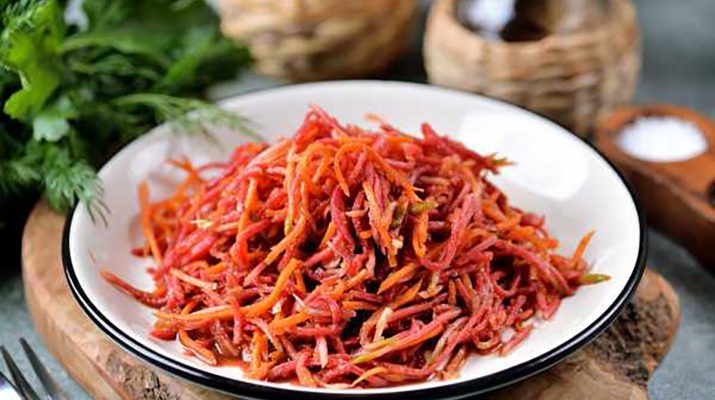 Это острый и ароматный салат из хрустящей редьки, маринованной в пряных специях и уксусе. Благодаря сочетанию остроты, кислинки и тонкой нотки кунжута, он отлично