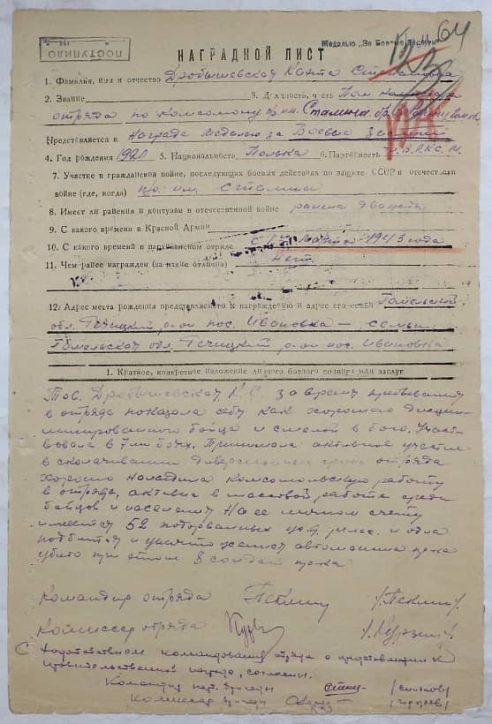 Из боевой характеристики на Дробышевскую можно узнать о её значительном вкладе в борьбу с врагом:«На боевом счету имеет одну подорванную автомашину, с группой взорвала 52 рельсы ж.д. полотна, уничтожила связь между Ручеевской-Сенское до 3000 метров, сожжено 3 (три) моста на шоссейно-грунтовых дорогах, истреблено более десятка немецких солдат.
