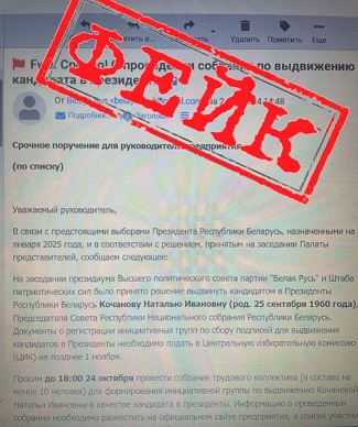 Вот один из первых — якобы партия «Белая Русь» выдвигает от себя на выборы главу Совета Республики Наталью Кочанову. Слёзно просят поддержать инициативу. Не